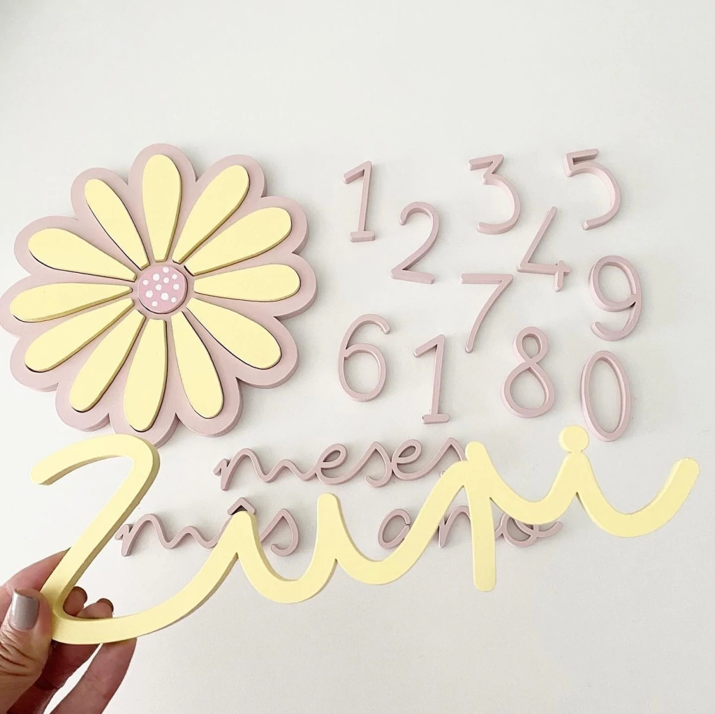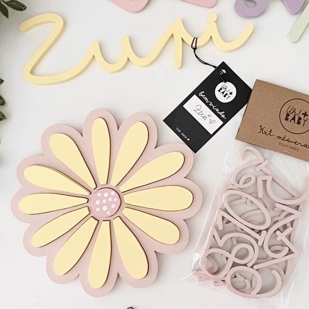 O kit contém uma flor com 12 pétalas que se destacam + palavrinhas mês, meses, ano + Números que formam os números 1 ao 12 + 1 Letreiro personalizado c/ nome. (Faremos a aprovação da arte do kit c/ o Letreiro personalizado na próxima etapa após a confirmação do pedido!😉)